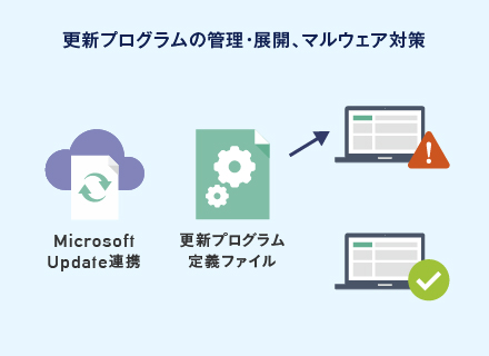 アップデートの際に、パソコン個別にインターネット上の更新データを受信するよりも、一元管理をすることにより安全性と負荷軽減が見込めます。